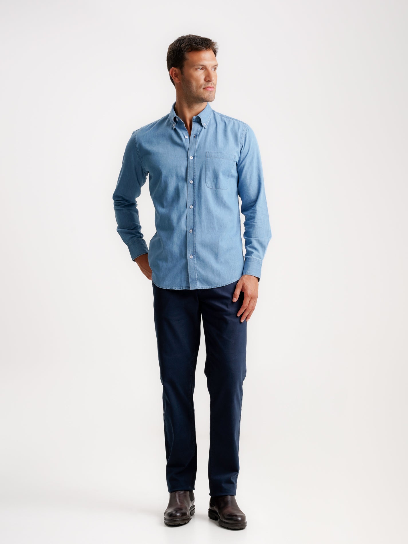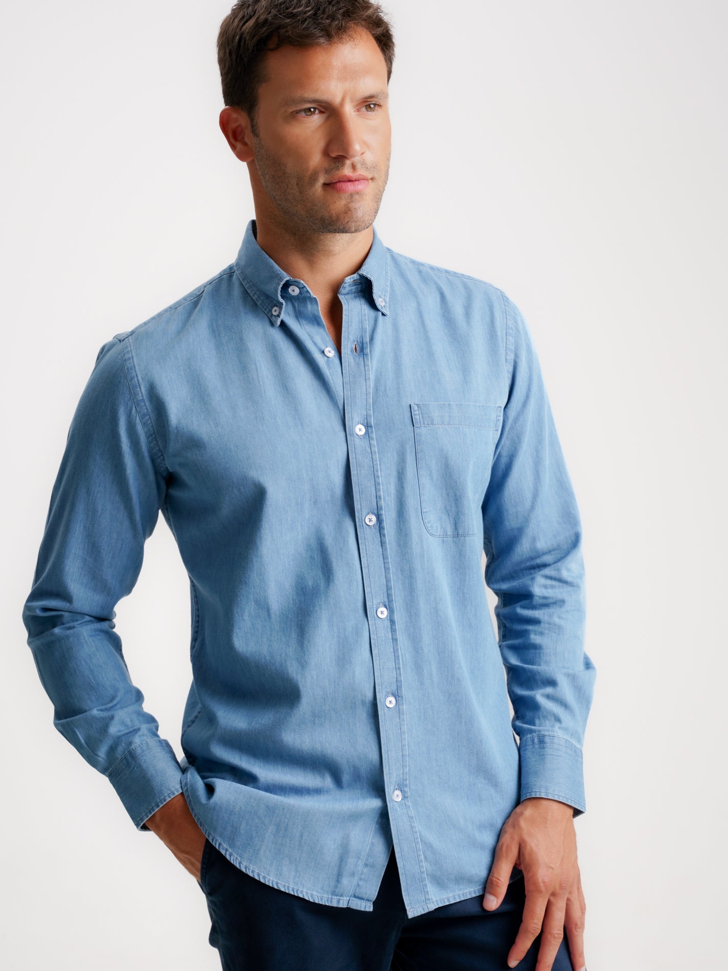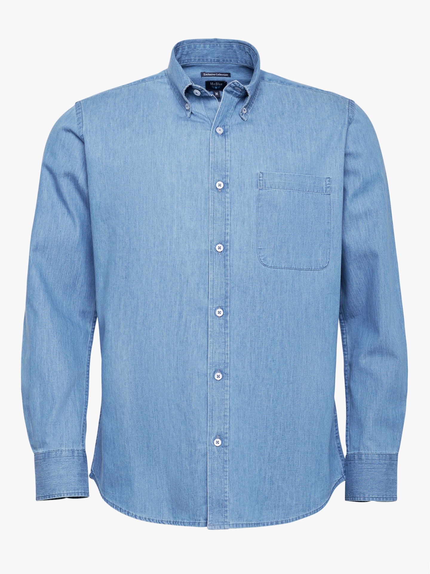 Camisa Regular Fit Denim Azul Manga Comprida Com Bolso Lisa