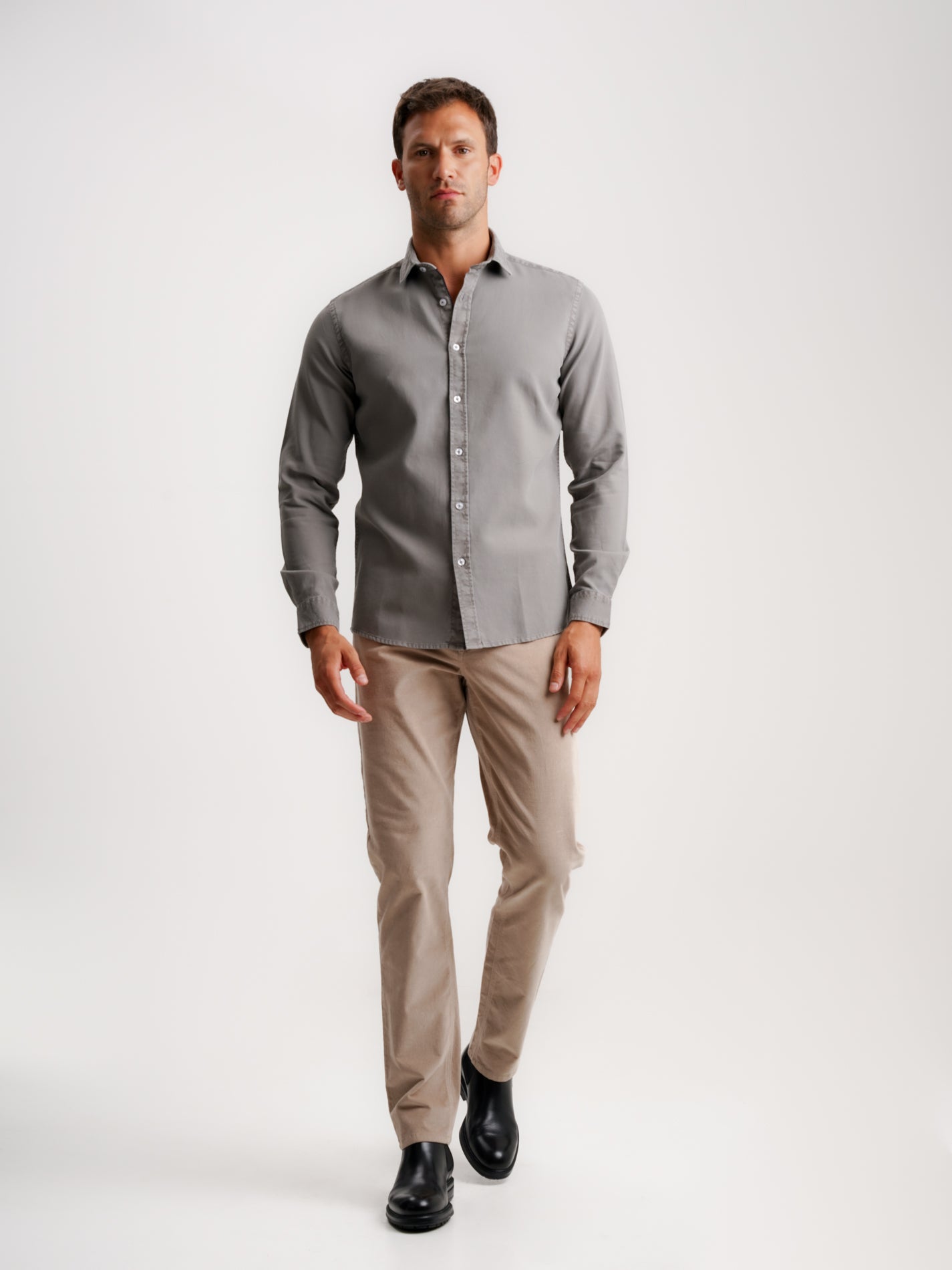 Camisa Tailored Fit Estruturada Cinzenta Manga Comprida Sem Logo e Sem Bolso Lisa